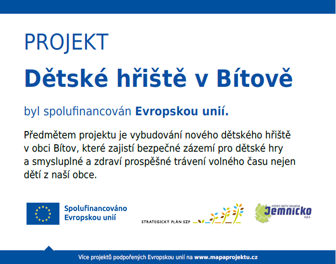 Dětské hřiště v Bítově je oficiálně otevřeno pro veřejnost! Využít můžete několik dětských prvků a velké pískoviště. V několika málo dnech bude nainstalováno posezení nejen pro děti, ale i pro odpočinek rodičů. Obec Bítov ve spolupráci s SDH Bítov již nyní plánuje několik dětských akcí, na které se můžete začít těšit.
